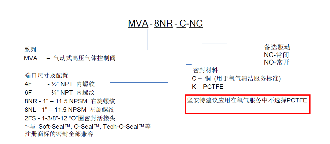 MVA系列氣動(dòng)高壓氣體控制閥適用于高要求的自動(dòng)化氣氣瓶充裝工廠、匯流排和管線系統(tǒng)。高壓氧氣服務(wù)的閥門密封選項(xiàng)C, 依據(jù)ISO7291(氧氣壓力沖擊測(cè)試)和ASTM G175(引燃測(cè)試),經(jīng)由第三方檢測(cè),非氧氣環(huán)境下,采用PCTFE密封,密封選項(xiàng)K。MVA系列閥門可以設(shè)定為長開(-NO)或常閉(-NC),有多重端口配置。常閉式閥門進(jìn)口壓力達(dá)5500PSI無泄漏,而且只需85PSI的壓力就可以完全使用閥門打開。